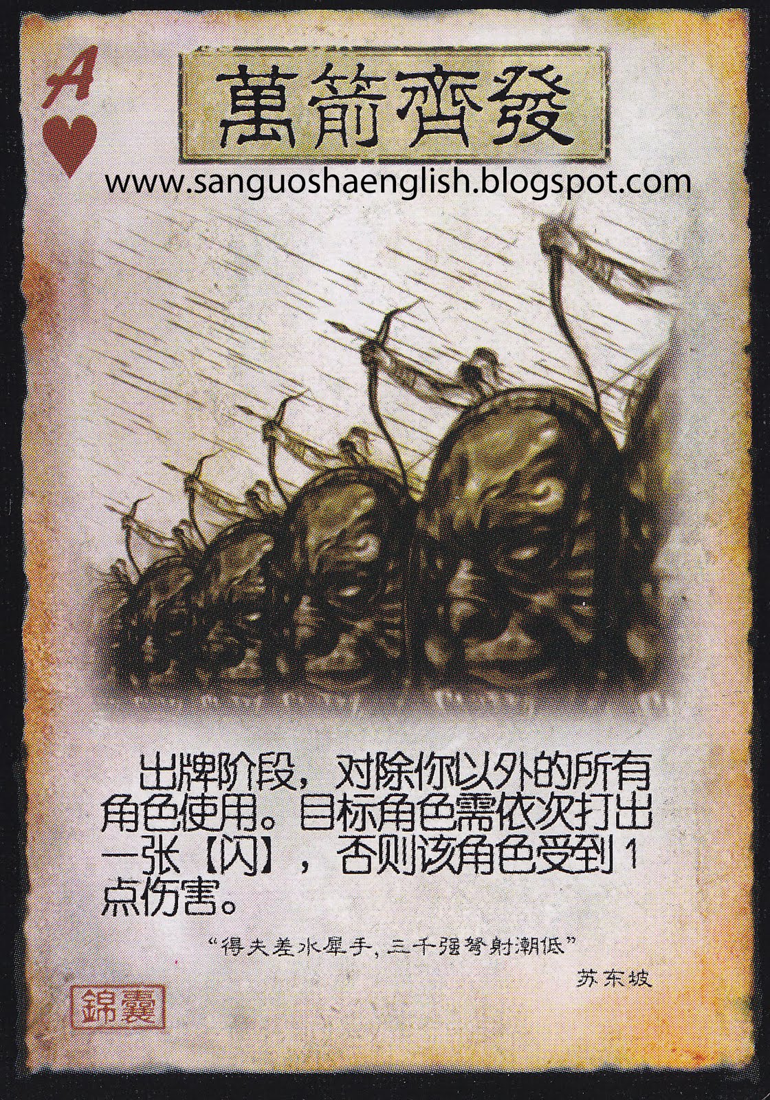 There was a scene from Lord of The Rings: The Two Towers, where Aragorn commands the elven archers to release their arrows against the orcs attacking Helm's Deep. Arrows rain from the sky, instantly impaling hundreds of orcs. This enactment is pretty much the same in the era of the Three Kingdoms. Use RAINING ARROWS to release arrows against every player. Players must use DODGE 闪 or NEGATE 无懈可击, or suffer 1 unit of health damage.